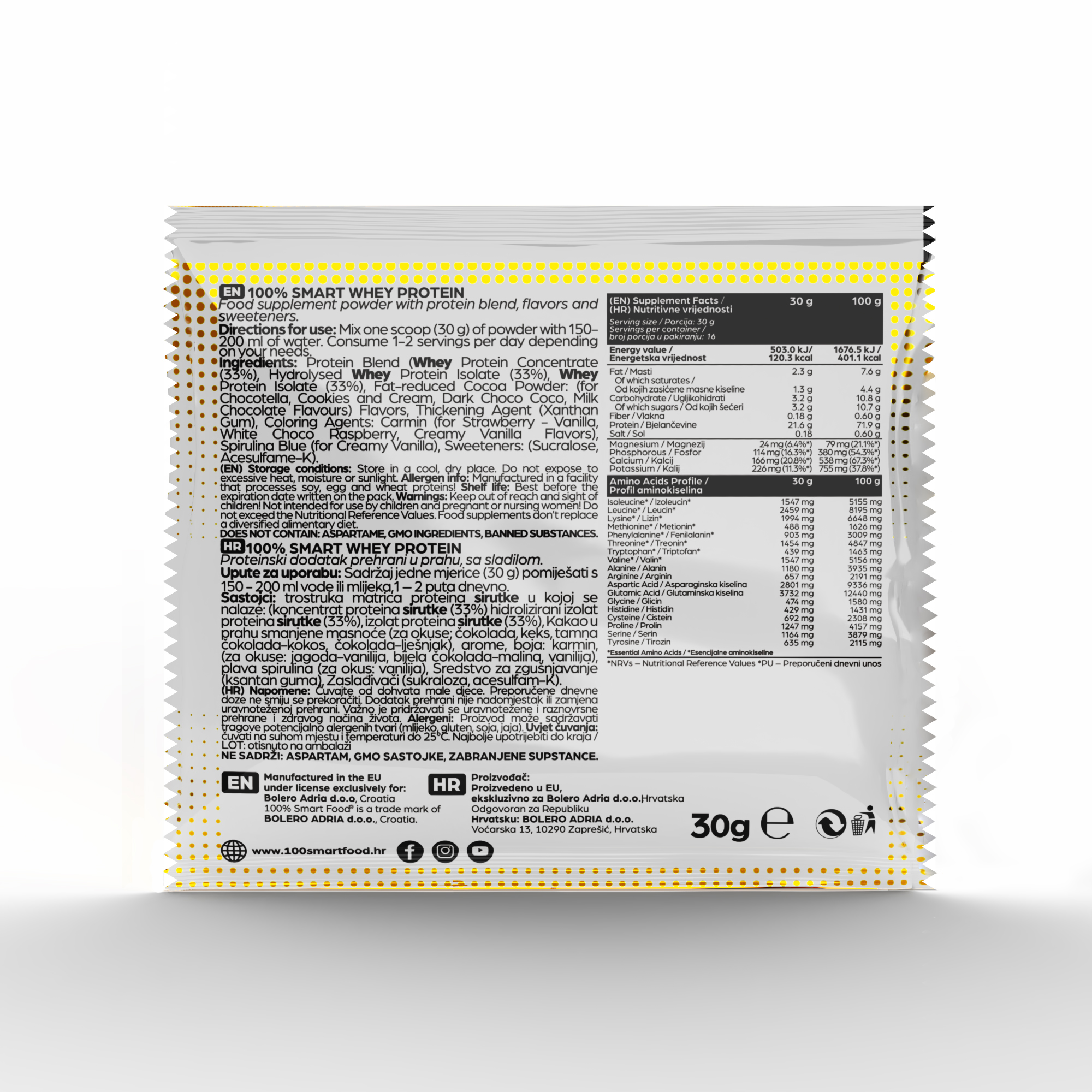 100 % Smart Whey Protein prinaša trojno beljakovinsko matrico – izolat, hidrolizat in koncentrat – v popolnem razmerju 33 : 33 : 33. Ta napredna trifazna formula zagotavlja še hitrejšo absorpcijo in maksimalno izkoristljivost beljakovin v primerjavi s klasičnimi whey izdelki. Zahvaljujoč dodatku BCAA in glutamina pomaga pri hitrejši regeneraciji mišic, izgradnji čiste mišične mase ter zmanjševanju utrujenosti po zahtevnih treningih.