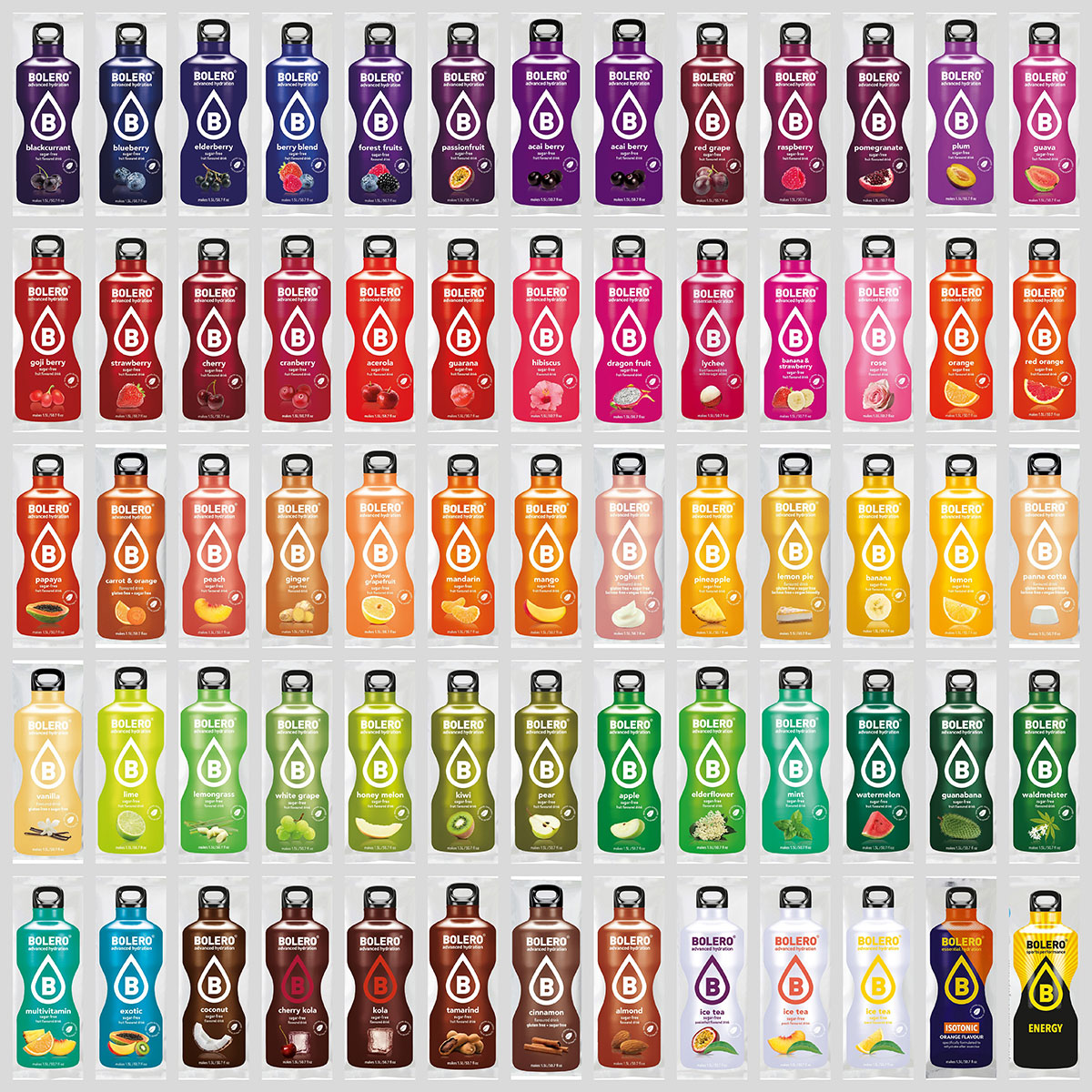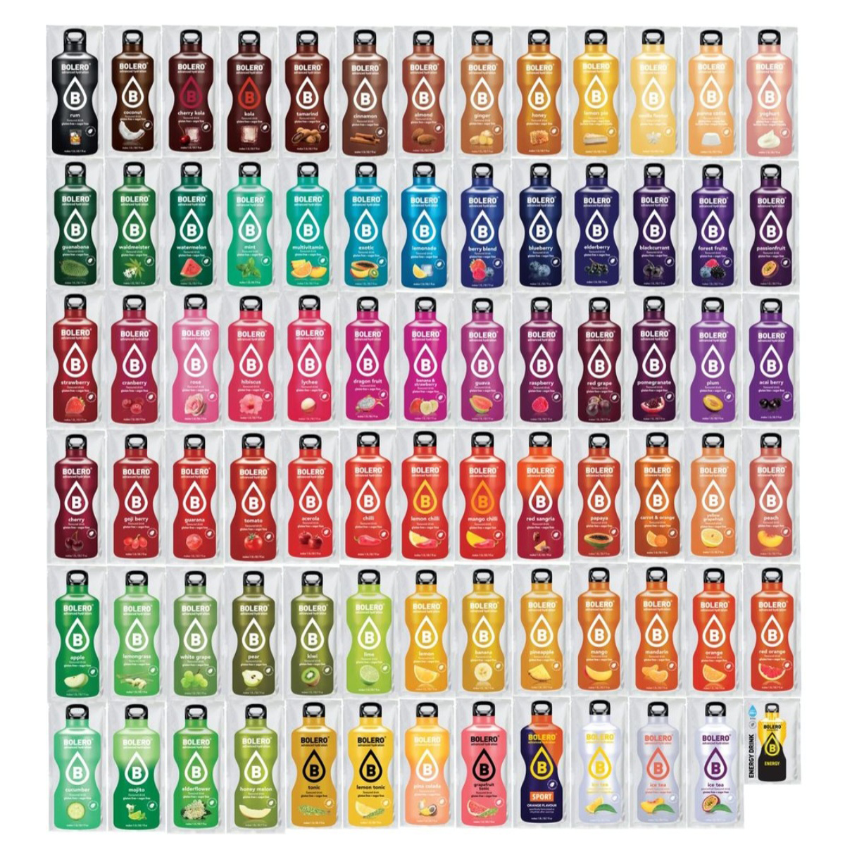 MANDLJ, JABOLKO, ACEROLA, ACAI JAGODE, BANANA JAGODA, GOZDNI SADEŽI, ČRNI RIBEZ, BOROVNICA, BANANA, VIŠNJA, KOKOS, BRUSNICA, VIŠNJA KOLA, KORENČEK POMARANČA, CIMET, KUMARA, ČILI, PITAJA, EXOTIC, CVET BEZGA, PLOD BEZGA, GOZDNI SADEŽI, INGVER, GUANABANA, GUARANA, GUAVA, GOJI JAGODE, GREJP TONIC, SLADKA MELONA, HIBISKUS, MED, KIVI, KOLA, LIMONA, LIČI, LIMETA, LIMONSKA TRAVA, LIMONINA PITA, LIMONADA, LIMONA ČILI, LIMONA TONIC, MANDARINA, MANGO, MULTIVITAMIN, META, MOJITO, MANGO ČILI, POMARANČA, PAPAYA, MARAKUJA, BRESKEV, HRUŠKA, ANANAS, GRANATNO JABOLKO, SLIVA, PANNA COTTA, PINA COLADA, MALINA, RDEČE GROZDJE, VRTNICA, RDEČA POMARANČA, RUM, RED SANGRIA, JAGODA, TAMARIND, PARADIŽNIK, TONIC, VANILIJA, LAZARKINJA, LUBENICA, BELO GROZDJE, RUMENI GREJP, JOGURT, YUZU, LEDENI ČAJ BRESKEV, LEDENI ČAJ LIMONA, LEDENI ČAJ MARAKUJA, SPORT, ENERGY.