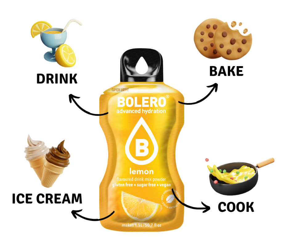 Bolero Drinks je mednarodna blagovna znamka instant napitkov v prahu, ki omogoča enostavno pripravo osvežilnih napitkov – brez sladkorja, umetnih barvil, aditivov in konzervansov. Napitki se pripravljajo z vodo, vsebujejo dnevni odmerek vitamina C in so praktično brez kalorij. Idealni so za športnike, diabetike, otroke, osebe na dieti in vse, ki želijo bolj zdravo alternativo okusu in hidraciji brez sladkorja. So ekonomični in praktični, saj je mogoče iz ene vrečke (9 g) pripraviti do 3 litre napitka.
